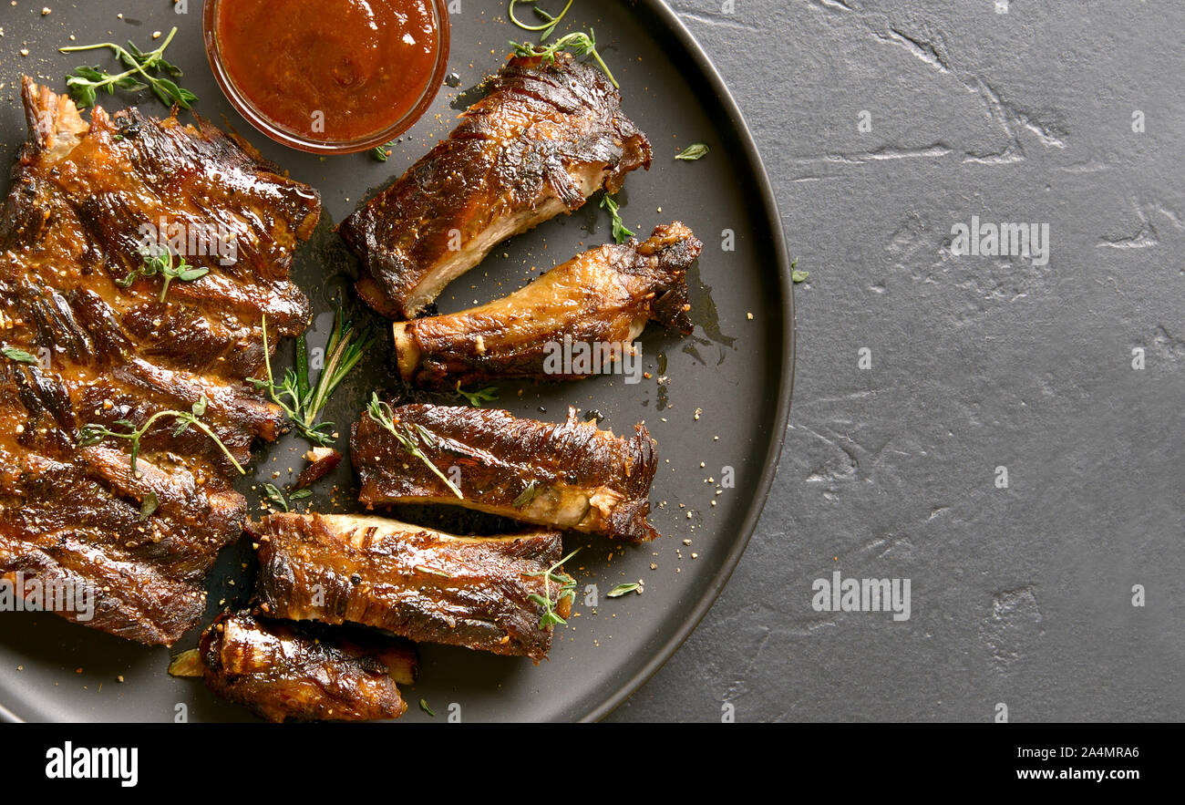 Bbq Ribs On Plate Over Black Stone Background Tasty Bbq Meat Top View Flat Lay Stock Photo Alamy
